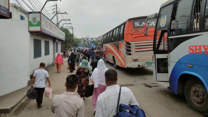 নারায়ণগঞ্জের সাইনবোর্ড এলাকা থেকে ঢাকার যাত্রাবাড়ী পর্যন্ত হাজারো যাত্রী হেঁটে যাচ্ছেন।