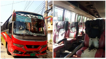 রাত ৯টা ৫৭ মিনিটে যাত্রাবাড়ী থানার সামনে একটি বাসে আগুন দেয় দুর্বৃত্তরা।