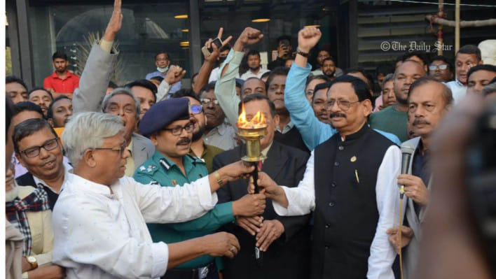 ‘মুক্তিযুদ্ধের বিজয় বীর বাঙালির অহংকার’ স্লোগানে মাসব্যাপী বিজয়মেলার বিজয়মঞ্চের আনুষ্ঠানিকতা শুরু হয়েছে।