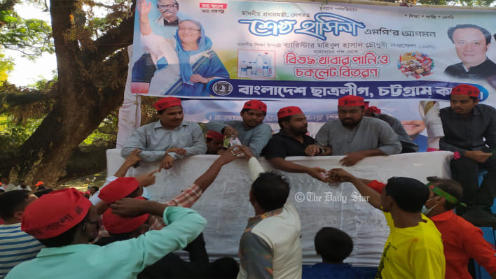 চট্টগ্রামের পলোগ্রাউন্ড মাঠে প্রধানমন্ত্রীর সমাবেশে যোগ দেওয়া আওয়ামী লীগ ও এর অঙ্গ এবং সহযোগী সংগঠনগুলোর নেতা-কর্মীদের মাঝে বিশুদ্ধ পানি বিতরণ করছেন ছাত্রলীগের নেতা-কর্মীরা।