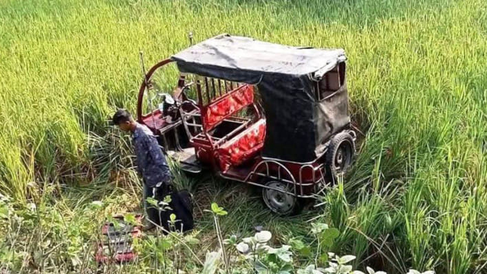 কেউ একজন রিকশার হাতলে হাত রাখলে মোটর চালু হয়ে রিকশাটি দ্রুত গতিতে সামনের দিকে চলতে শুরু করে এবং ওই নরীর গায়ের ওপর উঠে যায়।