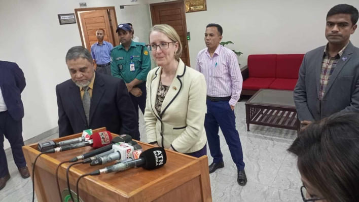 স্বাস্থ্য উপদেষ্টা নূরজাহান বেগম ও ব্রিটিশ হাইকমিশনার সারাহ কুক পঙ্গু হাসপাতালে আন্দোলনে আহতদের দেখতে যান।