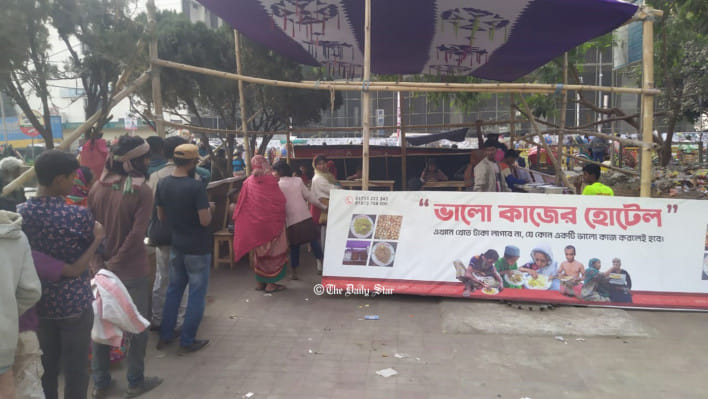 কোনো সুসজ্জিত কক্ষ নেই, নেই চেয়ার-টেবিল, ক্যাশ কাউন্টার, এমনকি কোনো হট্টগোলও নেই। রাজধানীর বিভিন্ন ফুটপাত ঘেঁষে খোলা আকাশের নিচে বেঞ্চ পেতে পরিচালিত এই হোটেলে প্রতিদিন খেতে আসেন কয়েক শ মানুষ।