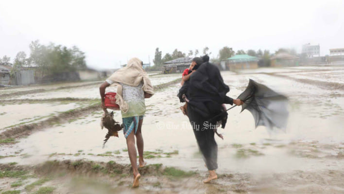 এই প্রবল দুর্যোগের ভেতরেও বাড়ির পোষা মুরগিটিকে সঙ্গে নিতে ভোলেননি তারা। ছবিতে উল্টে যাওয়া ছাতাটি দেখে বাতাসের প্রাবল্যও বোঝা যাচ্ছে।