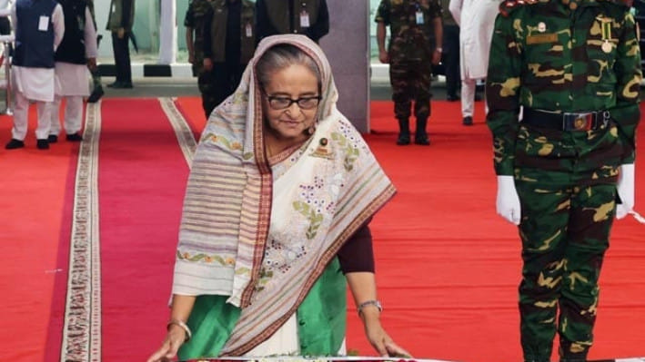 পুষ্পস্তবক অর্পণের পর প্রধানমন্ত্রী শেখ হাসিনা স্বাধীনতার স্থপতি বঙ্গবন্ধুর স্মৃতির প্রতি গভীর শ্রদ্ধা জানিয়ে কিছুক্ষণ নীরবে দাঁড়িয়ে থাকেন।