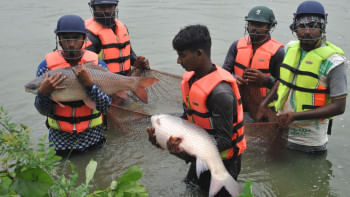 সাকলাইনের খামারের জেলেরা কোমর পানিতে নেমে বিশাল বিশাল মাছ ধরছেন। প্রত্যেকের মাথায় থাকে মোটরসাইকেলের শক্তপোক্ত হেলমেট, আর গায়ে কমলা রঙের সেফটি জ্যাকেট।