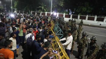 বঙ্গভবনের ফটকের সামনে পুলিশ, র্যাব, এপিবিএন ও বিজিবির সদস্যদের সতর্ক অবস্থান নিতে দেখা গেছে। সেখানে সেনাসদস্যরাও আছেন।