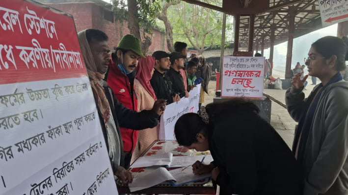 যাত্রী সমাবেশে ঠাকুরগাঁওয়ের রেলসেবার মানোন্নয়নে ১০ দফা দাবি তুলে ধরেন বক্তারা।