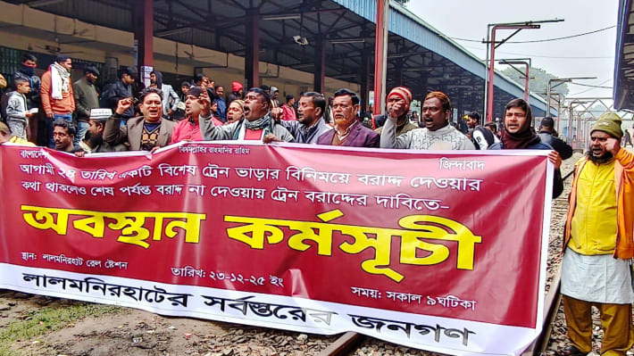 আজ মঙ্গলবার সকাল থেকে লালমনিরহাট রেলস্টেশনে রেললাইনের ওপর অবস্থান নিয়ে অবরোধ কর্মসূচি পালন করায় জেলাটি থেকে থেকে দেশের বিভিন্ন রুটে ট্রেন চলাচল বন্ধ হয়ে গেছে।