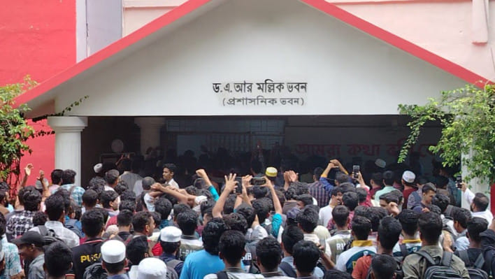 বিকেল ৩টা থেকে বিশ্ববিদ্যালয়ের প্রধান ফটকে শতাধিক শিক্ষার্থী জড়ো হয়ে বিক্ষোভ কর্মসূচি পালন শুরু করেন।