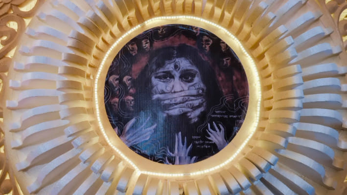 আলো আর অন্ধকারের খেলায় সাজানো প্যান্ডেলে যেন এক অদ্ভুত নীরবতা।