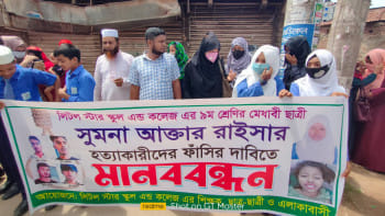 ঢাকার সাভারে লিটল স্টার স্কুল অ্যান্ড কলেজের নবম শ্রেণীর শিক্ষার্থী সুমনা আক্তার (১৬) হত্যাকারীদের সর্বোচ্চ শাস্তি ফাঁসির দাবিতে মানববন্ধন করেছে প্রতিষ্ঠানটির শিক্ষক-শিক্ষার্থী ও অভিভাবকরা।