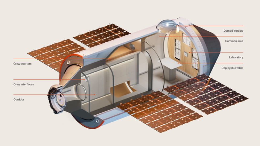 স্টেশনটির ব্যাস হবে ৪ দশমিক ৪ মিটার এবং ভেতরের ব্যবহারযোগ্য আয়তন হবে প্রায় ৪৫ কিউবিক মিটার— যা আইএসএসের তুলনায় আট ভাগের এক ভাগ। যদিও এটি কোনো বিলাসবহুল হোটেল নয়, তবুও মানুষকেন্দ্রিক নকশা, বড় জানালা, ব্যক্তিগত ঘুমের জায়গা, কমিউনাল টেবিল এবং স্টারলিংক ইন্টারনেট সংযোগ থাকার ফলে এটি আরামদায়ক ও কার্যকর থাকার অভিজ্ঞতা দেবে।